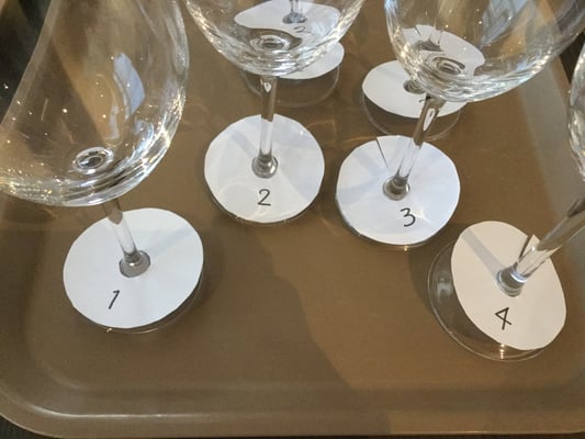 写真のようにグラスに番号を振り、ブラインド(ぶどう品種、ワイン名を告げず)で味わってもらいました。